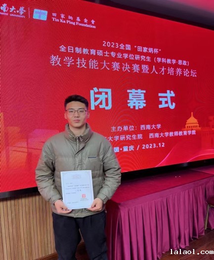 12月3日,由全国教育硕士研究生教学技能大赛专家委员会指导,田家炳基金会冠名,西南大学主办,西南大学研究生院、教师教育学院承办的2023年“田家炳”杯教育硕士(思政)专业教学技能大赛决赛在西南大学圆满落下帷幕。经过激烈角逐,我院2022级学科教学(思政)专业研究生崔子旺荣获大赛二等奖,张枫林老师荣获优秀指导教师奖。