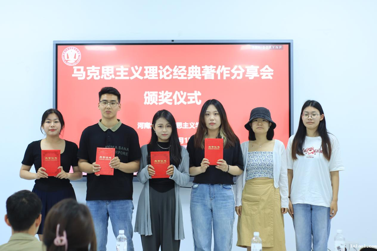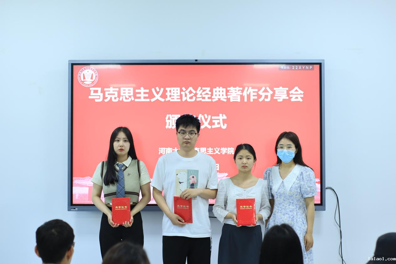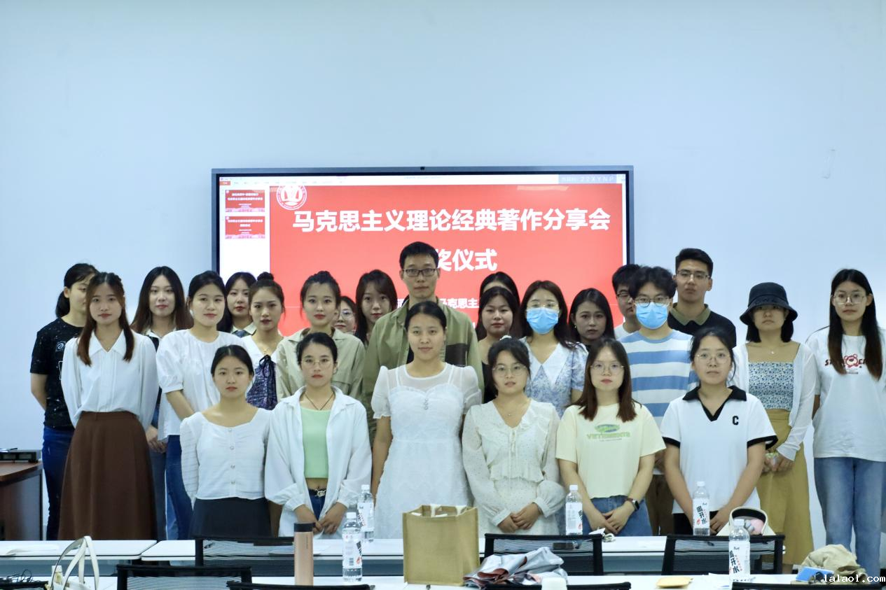 本次活动采取抽签的方式决定分享顺序,参赛人员围绕所讲书目依次进行分享,从《论犹太人》《1844年经济学哲学手稿》《德意志意识形态》到《共产党宣言》等经典著作,选手们借助课件PPT、视频,通过理论背景、主要内容、价值意义等方面解读经典书目,带领观众深刻感受着属于马克思主义经典著作的独有魅力。现场气氛高涨,参会同学全神贯注,掌声不断。在休息环节,全体同学集体观看关于马克思主义发展历程的微视频,并就参赛选手的分享书目积极展开提问与交流,纷纷表达自己的看法,在热烈的讨论中碰撞出思想的火花。经过激烈角逐,袁贝贝同学获得了比赛一等奖,李海彬、吴双双、张鑫同学获得了二等奖,包怡澜、崔子旺、马曼蕊、王欣怡同学获得了三等奖。评委老师依次为获奖选手颁发了奖状并进行合影留念。