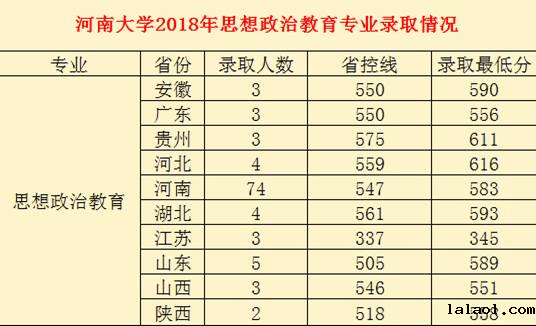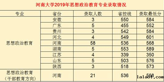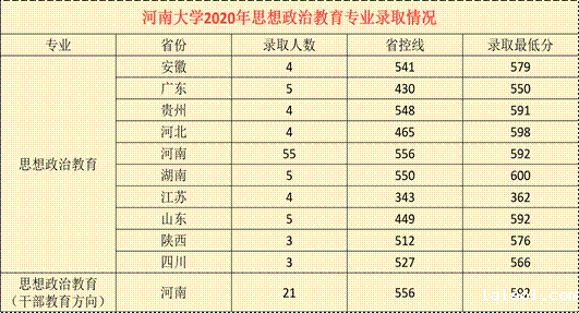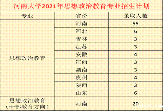 思想政治教育(含干部教育方向) 属师范类。思想政治教育专业发轫于1960年的政治教育专业,20世纪80年代改称为思想政治教育专业,是河南大学办学历史悠久、办学经验丰富、办学成就突出的传统优势学科之一。1997年, 思想政治教育专业获批硕士学位授予权,为国内第一批获批此学位授予权的单位。思想政治教育专业自创设以来为河南省乃至全国培养马克思主义理论的学科骨干和专业人才4000余人,获得了社会各界的广泛赞誉。原国防部长梁光烈、海南省政协主席毛万春、原最高人民法院副院长张述元、原河南省政协副主席张广智,教育部长江学者特聘教授、中国人民大学国际关系学院院长杨光斌等著名政界人士和专家学者均从该专业毕业。