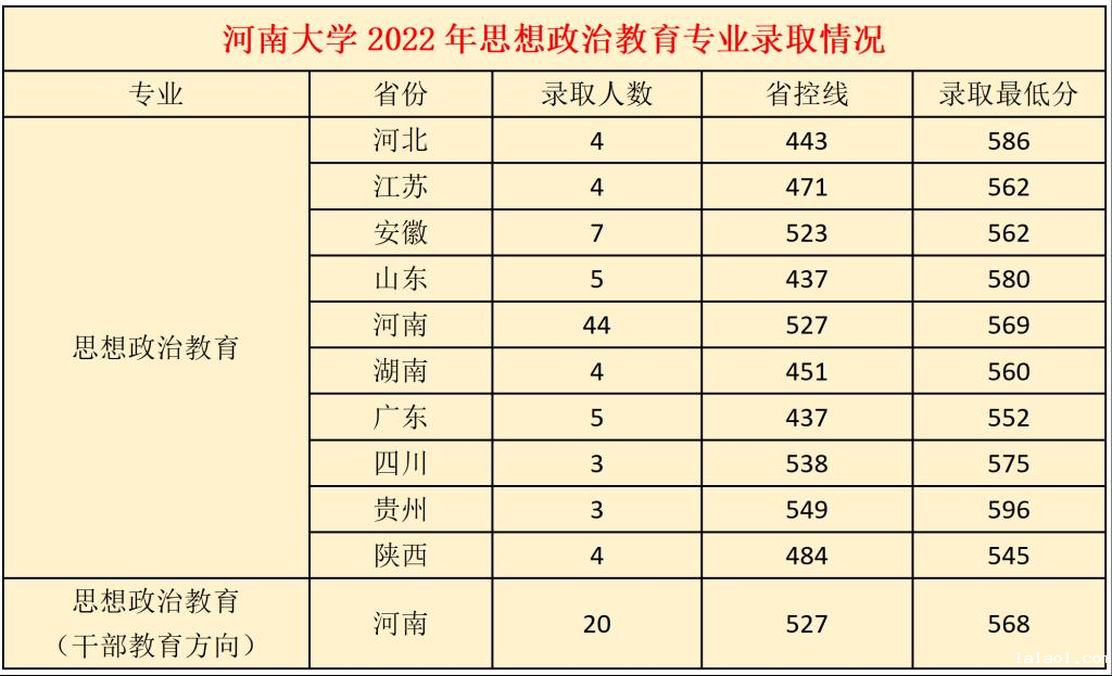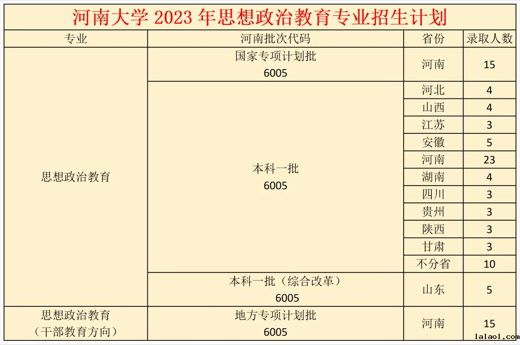 思想政治教育(含干部教育方向) 属师范类。思想政治教育专业发轫于1960年的政治教育专业,20世纪80年代改称为思想政治教育专业,是河南大学办学历史悠久、办学经验丰富、办学成就突出的传统优势学科之一。1997年,思想政治教育专业获批硕士学位授予权,为国内第一批获批此学位授予权的单位。思想政治教育专业自创设以来为河南省乃至全国培养马克思主义理论的学科骨干和专业人才4000余人,获得了社会各界的广泛赞誉。原国防部长梁光烈、海南省政协主席毛万春、原最高人民法院副院长张述元、原河南省政协副主席张广智,教育部长江学者特聘教授、中国人民大学国际关系学院院长杨光斌等著名政界人士和专家学者均从该专业毕业。