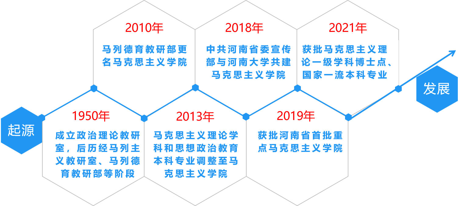 hth华体会体育在线app的前身是1950年成立的河南大学政治理论教研室,后历经马列主义教研室、马列主义教研部、马列德育教研部等阶段,2010年正式更名为hth华体会体育在线app。2013年9月,学校进行马克思主义理论学科调整,马克思主义理论学科由hth华体会体育在线app负责建设。2018年10月,中共河南省委宣传部与河南大学共建hth华体会体育在线app。2019年2月,学院入选河南省首批重点hth华体会体育在线app建设单位。2019年11月,学校与焦裕禄干部学院共建焦裕禄精神研究院。2021年,学院获批马克思主义理论一级学科博士点;思想政治教育专业获批国家一流本科专业。