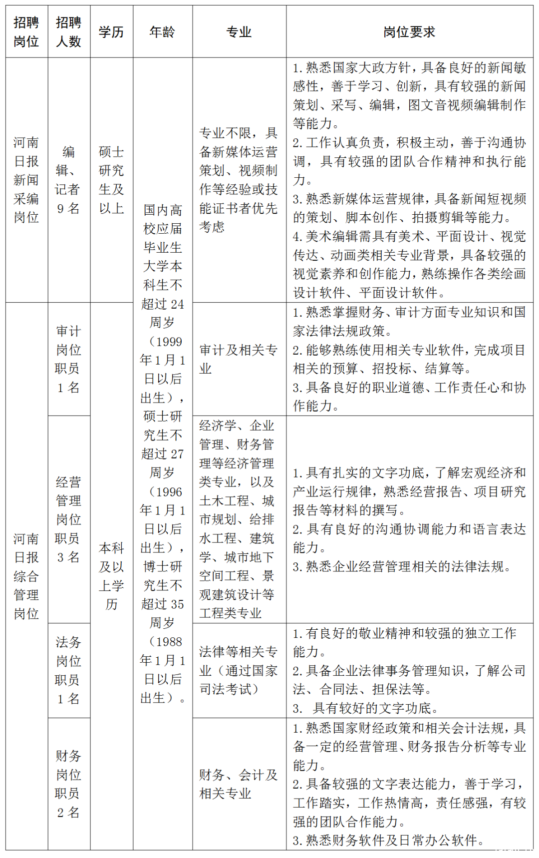 根据事业发展需要,诚聘优秀大学毕业生到河南日报社工作,欢迎报考,具体事宜如下: