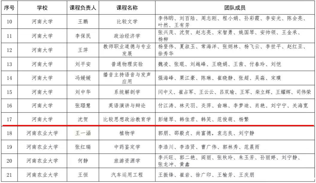 在河南省教育厅公布的《关于公布河南省本科高校2023年课程思政项目建设名单和2020、2021年度立项项目验收认定结果名单的通知》中,我院教师沈贺申报的《比较思想政治教育学》被评定为河南省本科高校课程思政样板课程,课程授课团队被认定为河南省课程思政教学样板团队。