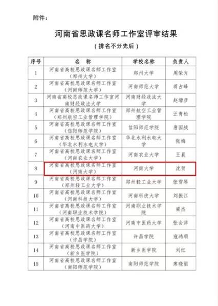 近日,中共河南省委教育工委、河南省教育厅公布《关于河南省高校思政课名师工作室评审结果的公示》,河南大学组织申报的“河南大学沈贺思政课名师工作室”榜上有名。此次评选活动自今年4月启动,经各高校申报、资格审查、专家评审、综合评议等环节,评选出15个河南省高校思政课名师工作室。