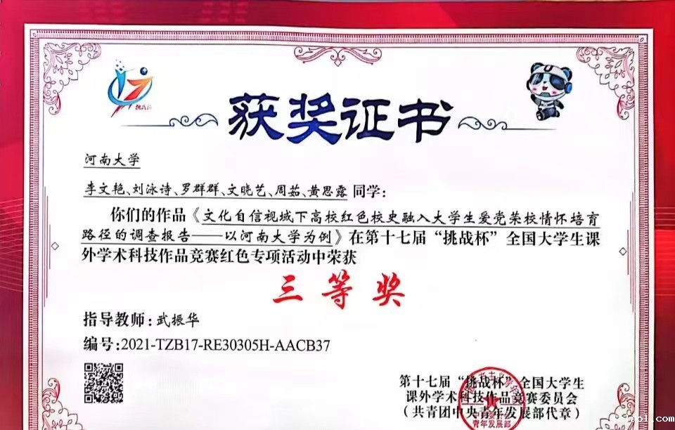 第十七届“挑战杯”全国大学生课外学术科技作品竞赛红色专项活动圆满落下帷幕。在此次赛事中,河南省高校共获全国二等奖两项、三等奖五项,其中,我院参赛的学生团队作品《文化自信视域下高校红色校史融入大学生爱党荣校情怀培育路径的调查报告——以河南大学为例》荣获全国三等奖。