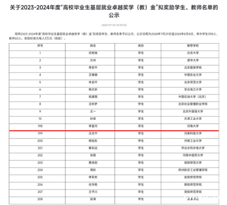 据中国教育发展基金会公布的2023-2024年度“全国高校毕业生基层就业卓越奖学(教)金”获奖名单,我院思想政治教育专业2018届毕业生李显河获此奖励。本次全国共评选398名毕业生,其中,河南省共有24名师生获得奖项(我校1名),这也是我校毕业生首次获得该项荣誉。
